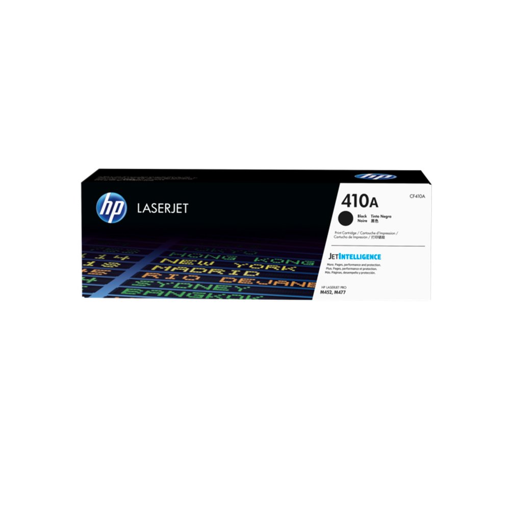 Cartucho modelo: CF410A; HP 410A (CF410A) Black Original LJ Toner Cartridge Tecnología: Laser; Precentación: Toner; Color: Negro; Compatibilidad: Impresora color HP LaserJet Pro serie M252, impresora multifunción color HP LaserJet serie M277; Rendimiento: aproximadamente 2300 páginas