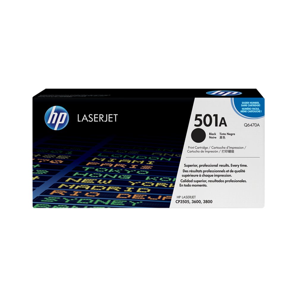 Cartucho modelo: Q6470A; HP 501A (Q6470A) Black Original LJ Toner Cartridge Tecnología: Laser; Precentación: Toner ; Color: negro; Compatibilidad: Serie de impresoras color HP LaserJet CP3505, 3600 y 3800; Rendimiento: aproximadamente 6000 páginas