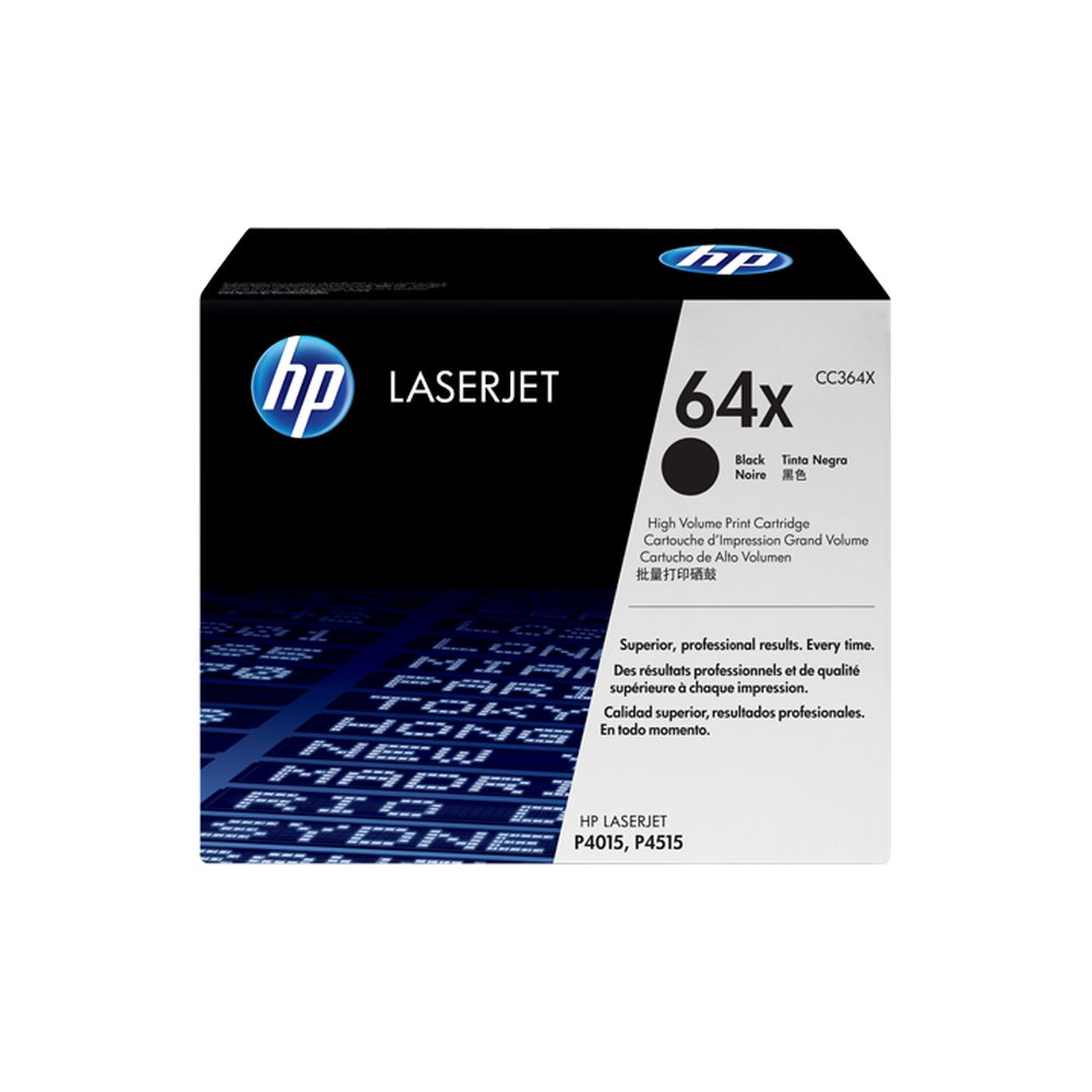 Cartucho modelo: CC364X; HP 64X (CC364X) Black High Yield Original LJ Toner Cartridge Tecnología: Laser; Precentación: Toner; Color: Negro; Compatibilidad: Serie HP LaserJet P4015, serie HP LaserJet P4515; Rendimiento: aproximadamente 24000 páginas